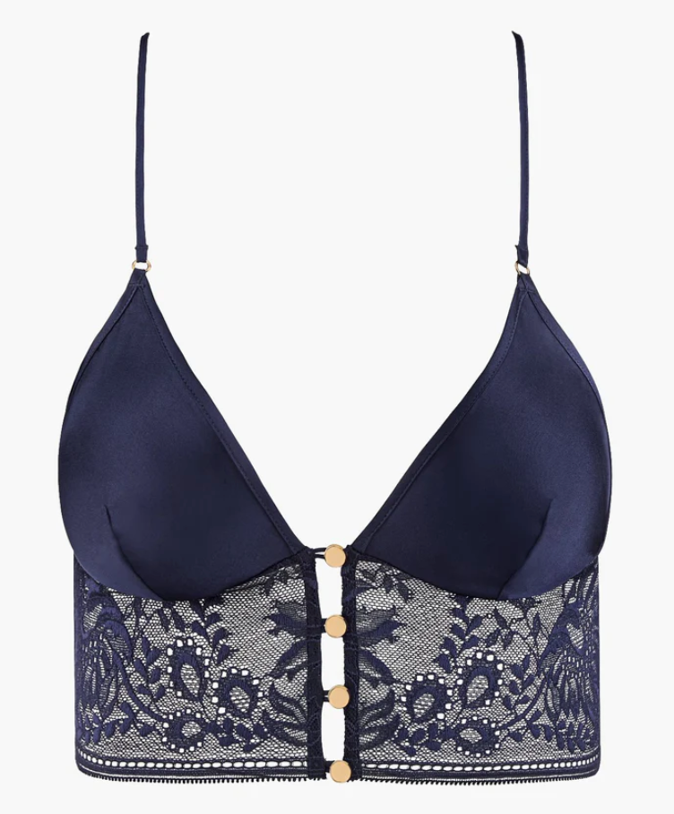 • An unlined triangle combining silk and lace trim, highlighted with golden buttons