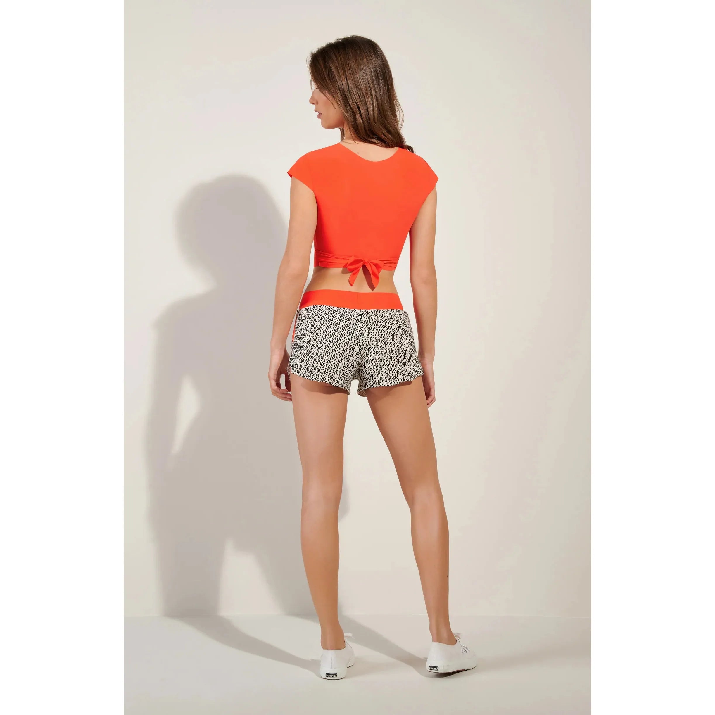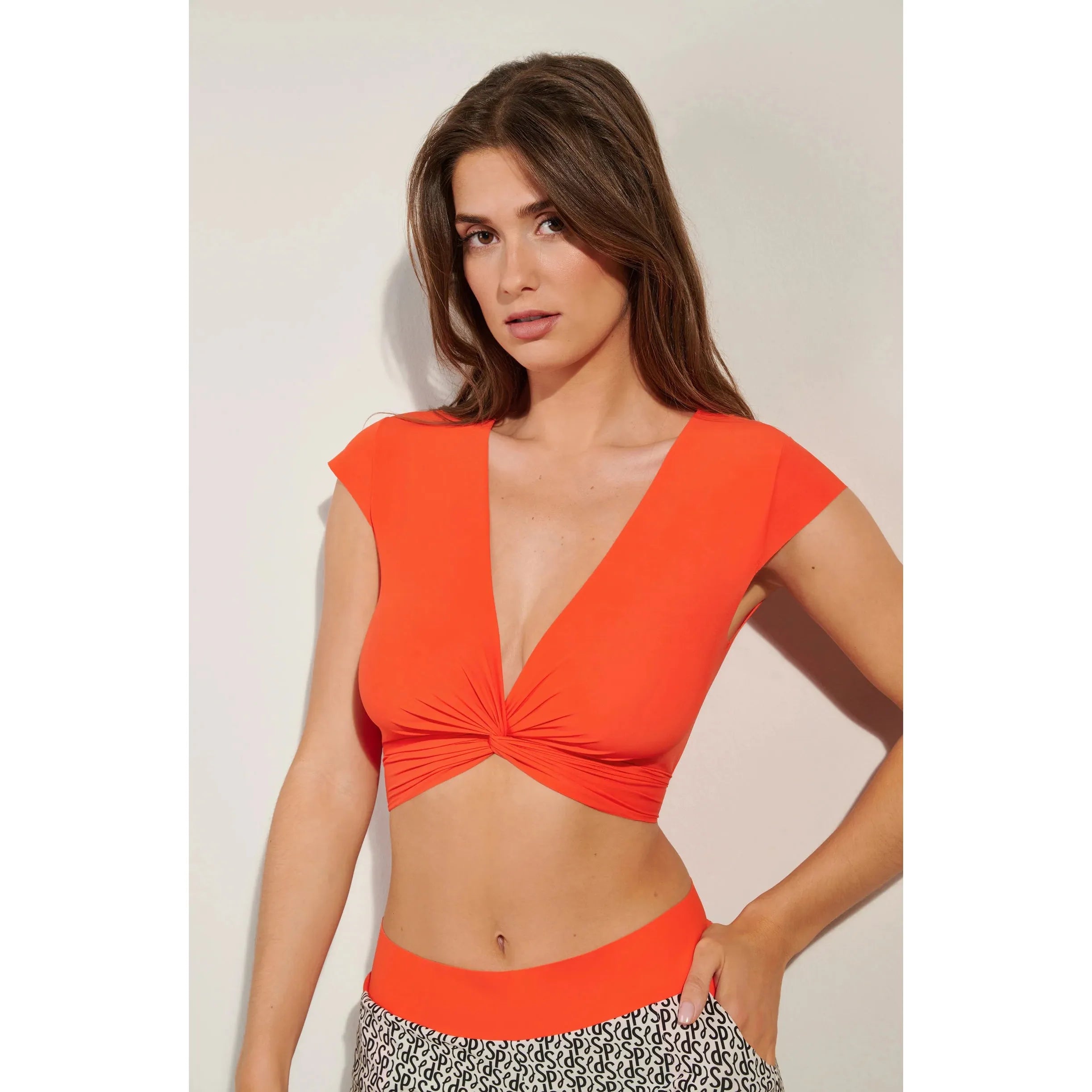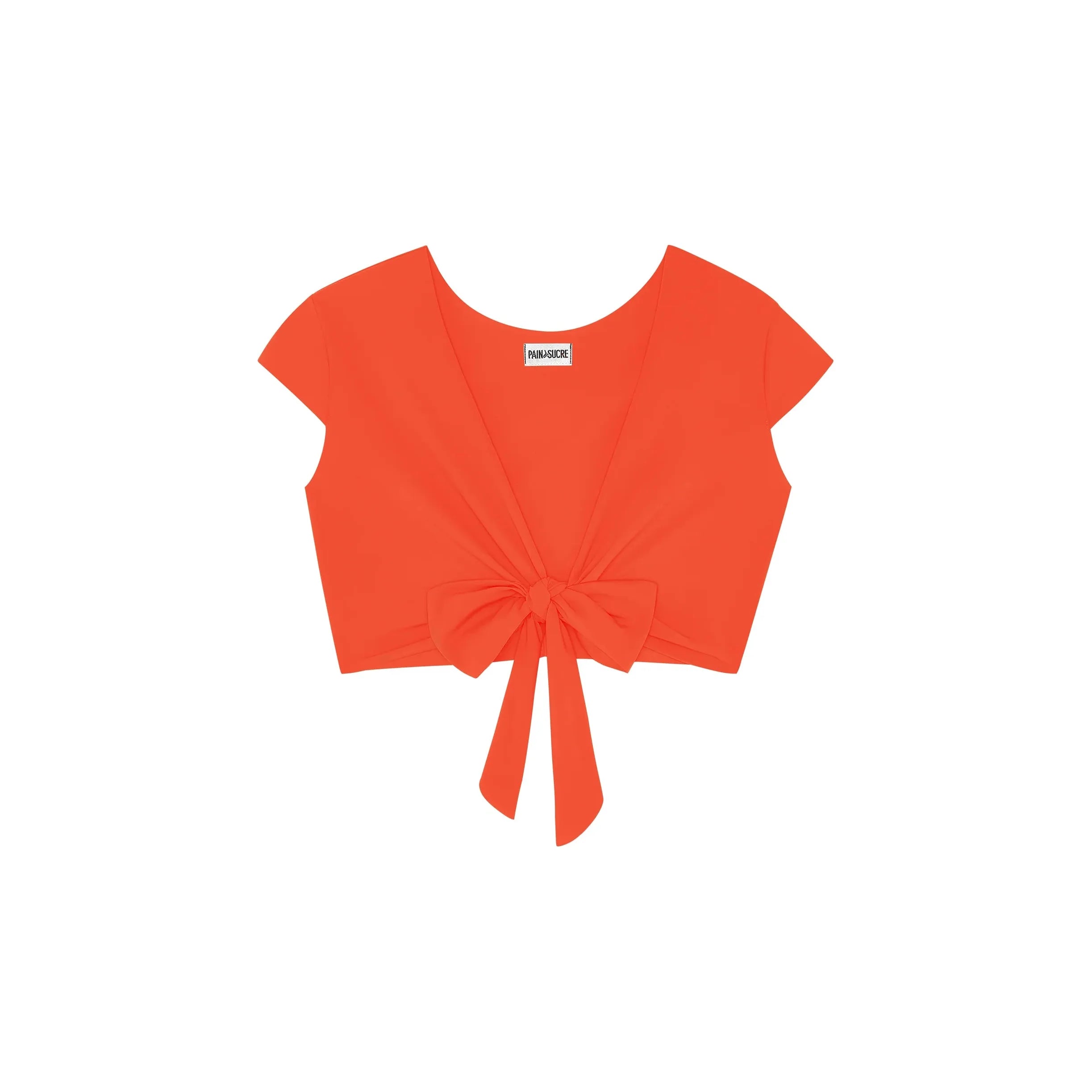 The wrap crop top TAKO mixes comfort and elegance. A fitted cut and light sleeves on the shoulders protect your skin from the sun. It can be tied in different ways according to your wishes, at the front or the back. This top will highlight the most beautiful necklines. Orange, a modern and intensely zesty colour.