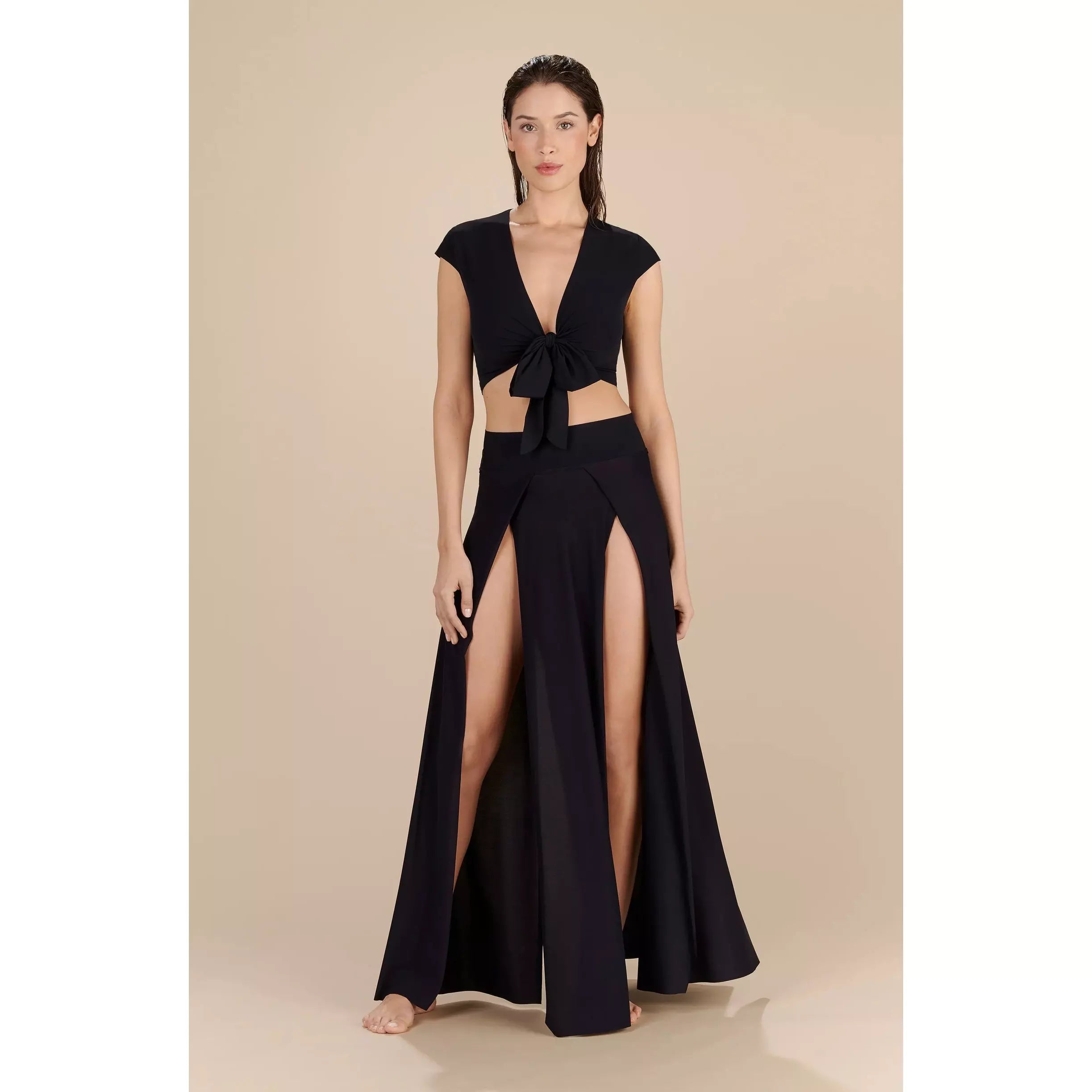 JAX breaks the rules of the classic long-flared skirt. Open with four facets, its flowing voile flutters with airy grace. This characterful piece reveals femininity—the ocean blue colour, an abyssal blue that makes you want to set sail.