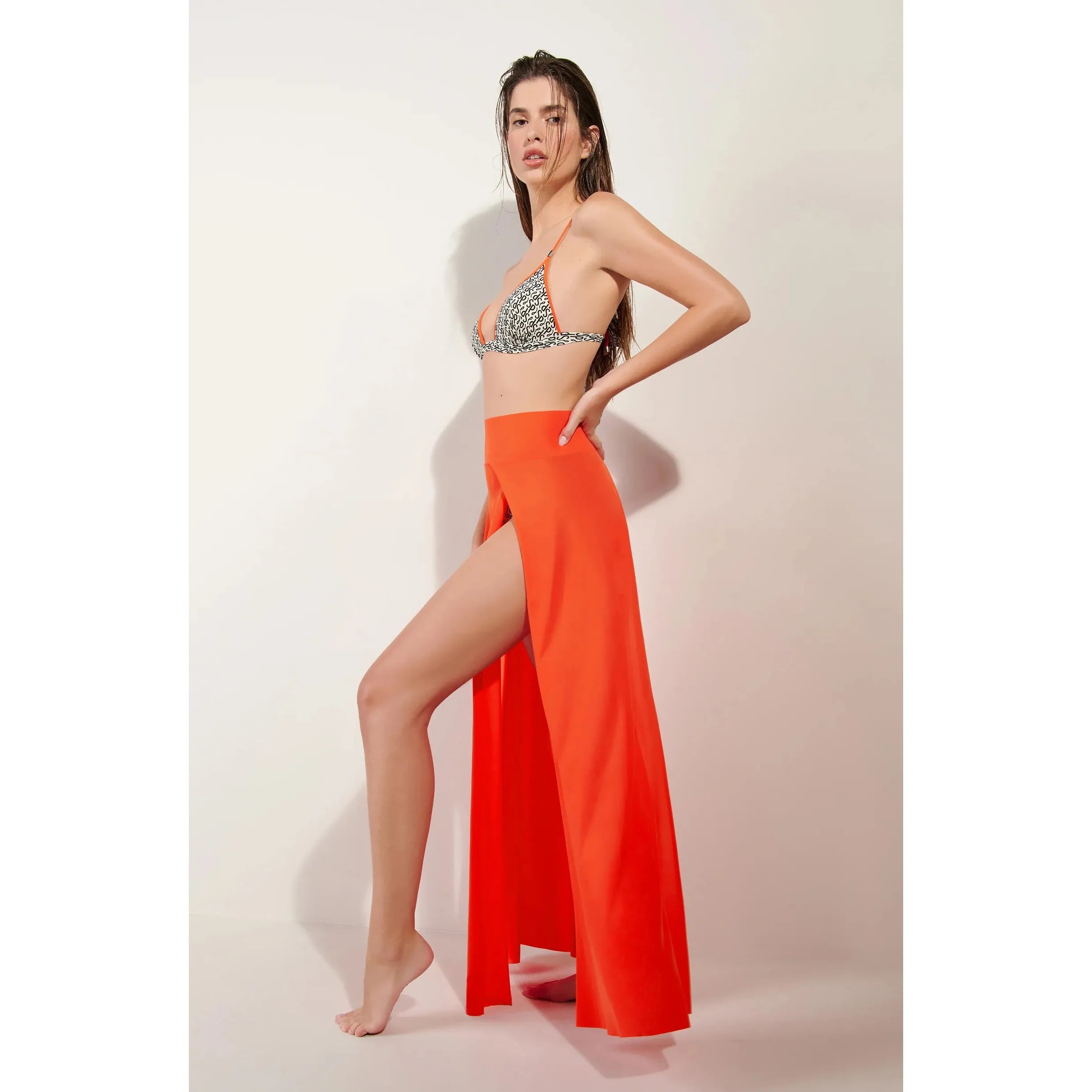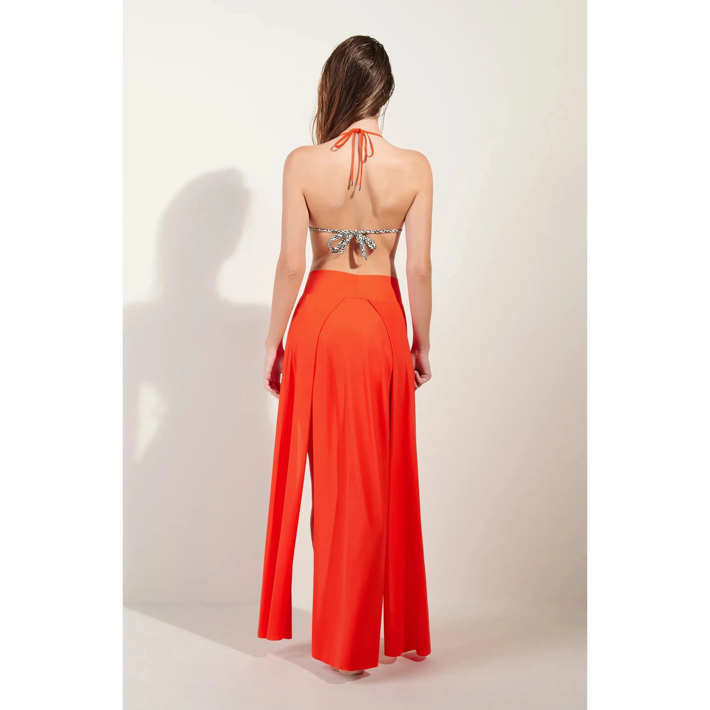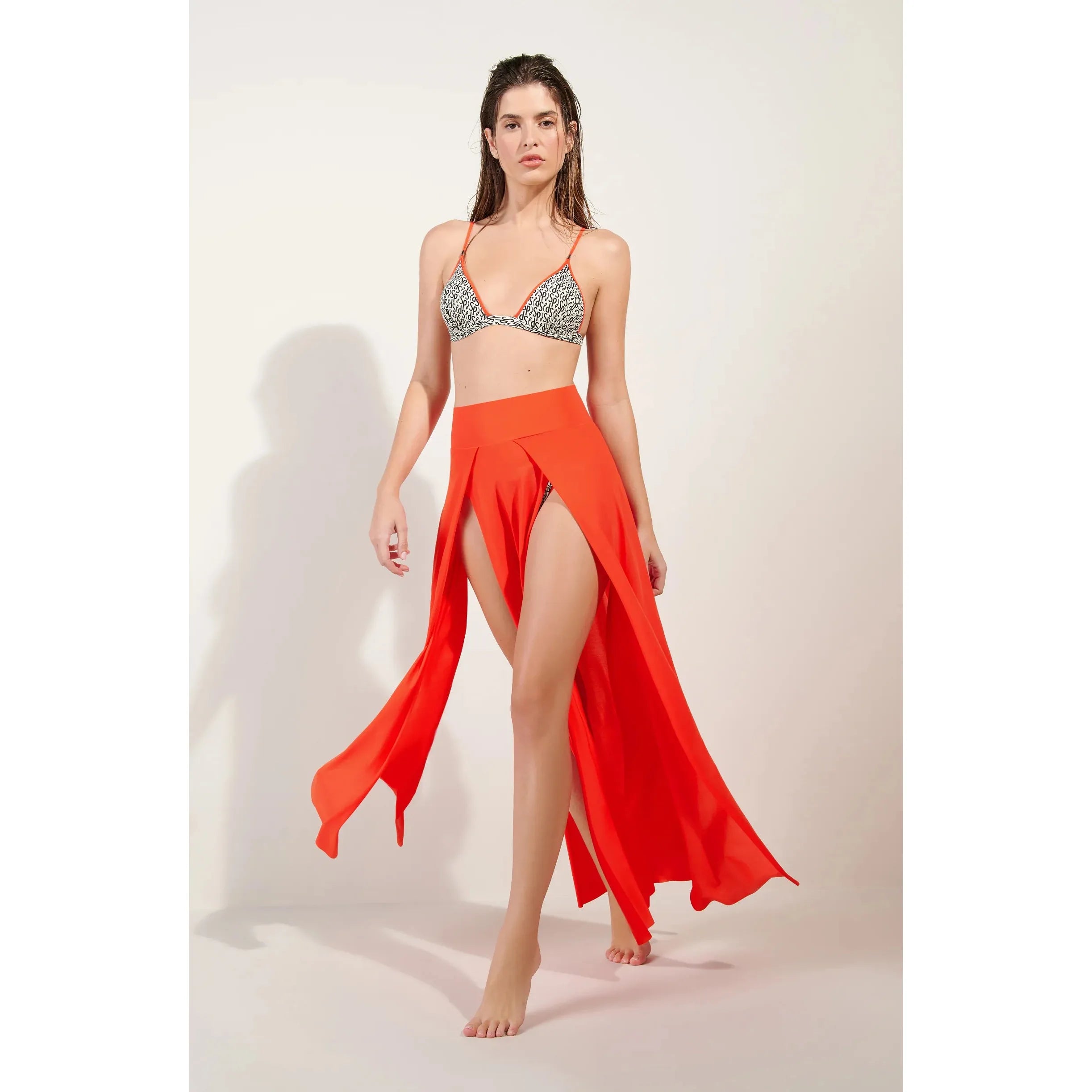 JAX breaks the rules of the classic long flared skirt. Open with four panels, its flowing voile flutters lightly and gracefully. This characterful piece exceptionally reveals the femininity. Orange, a modern and intensely zesty colour.