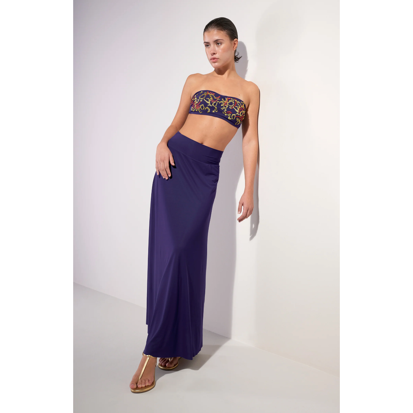 Flared skirt or strapless dress, JAYA can be worn according to your wishes and outings. Its flowing fabric is boosted with a wide elastic waistband to elegantly fit all body types. In stunning Purple.