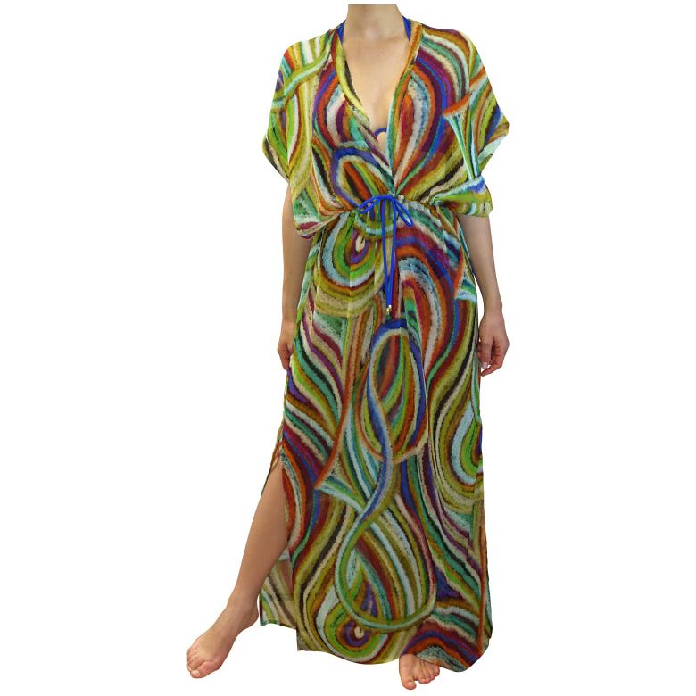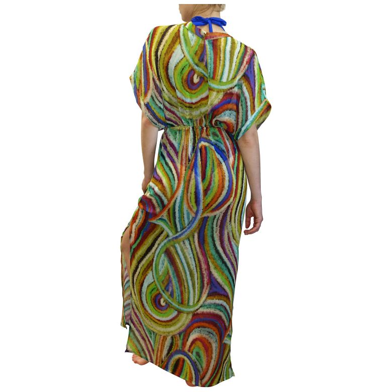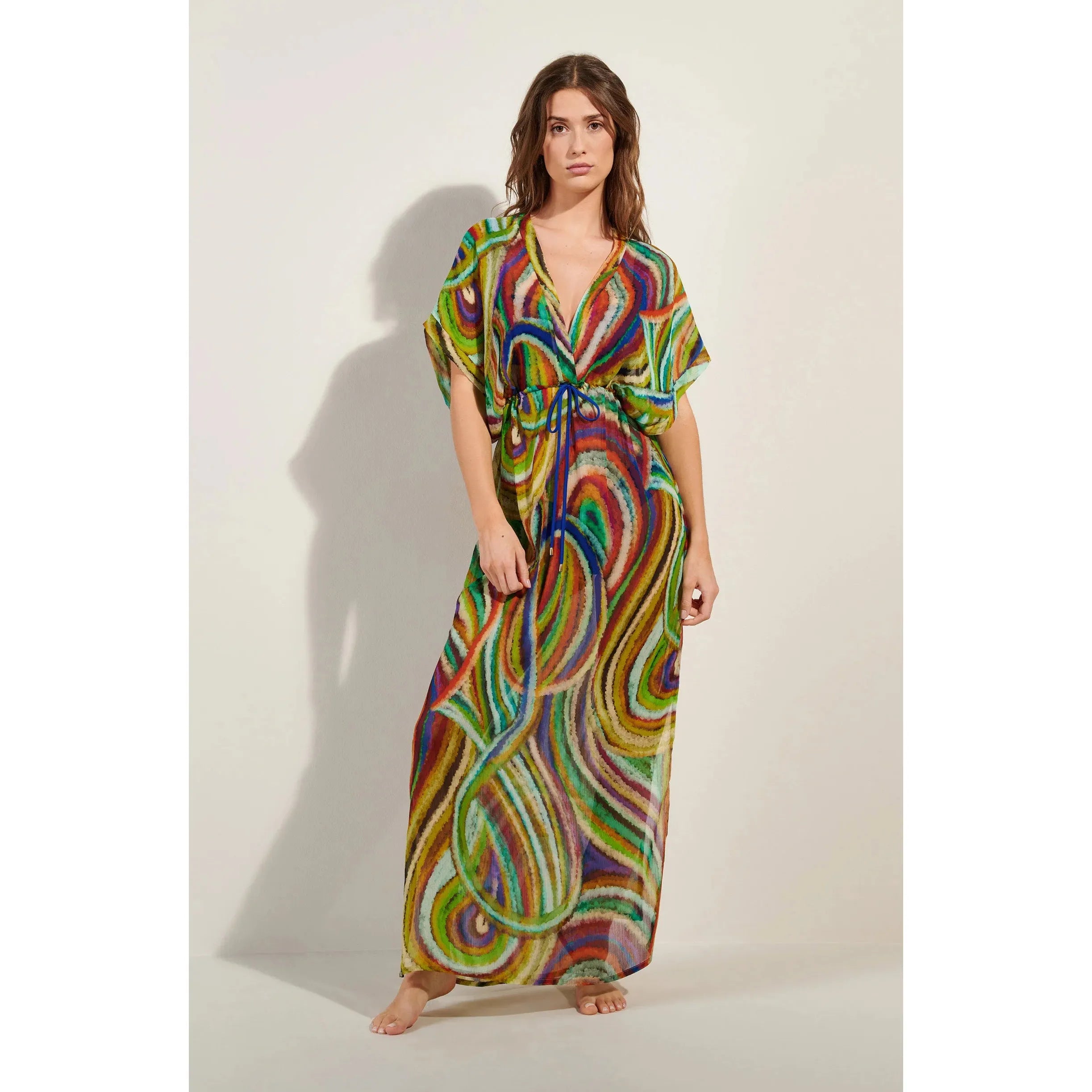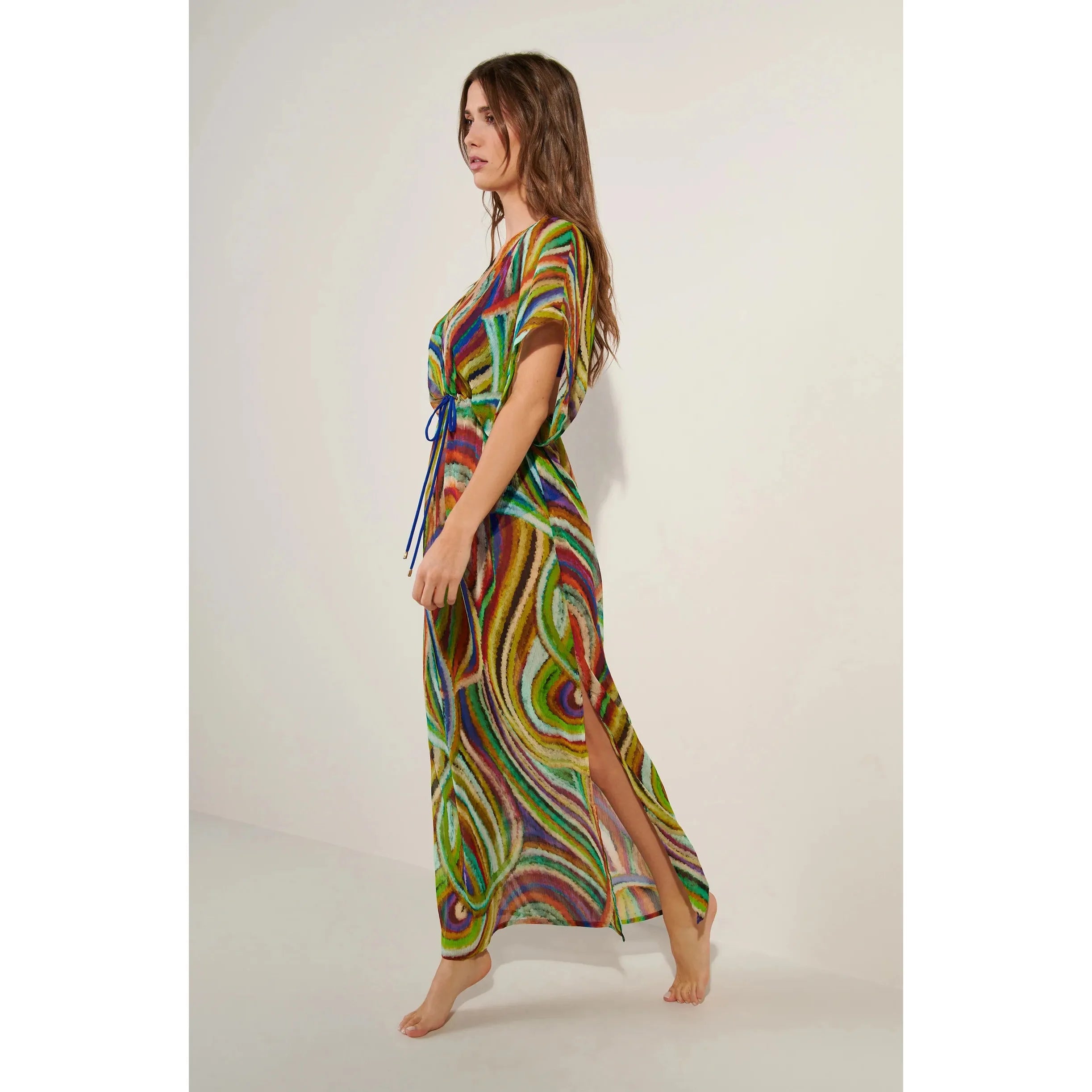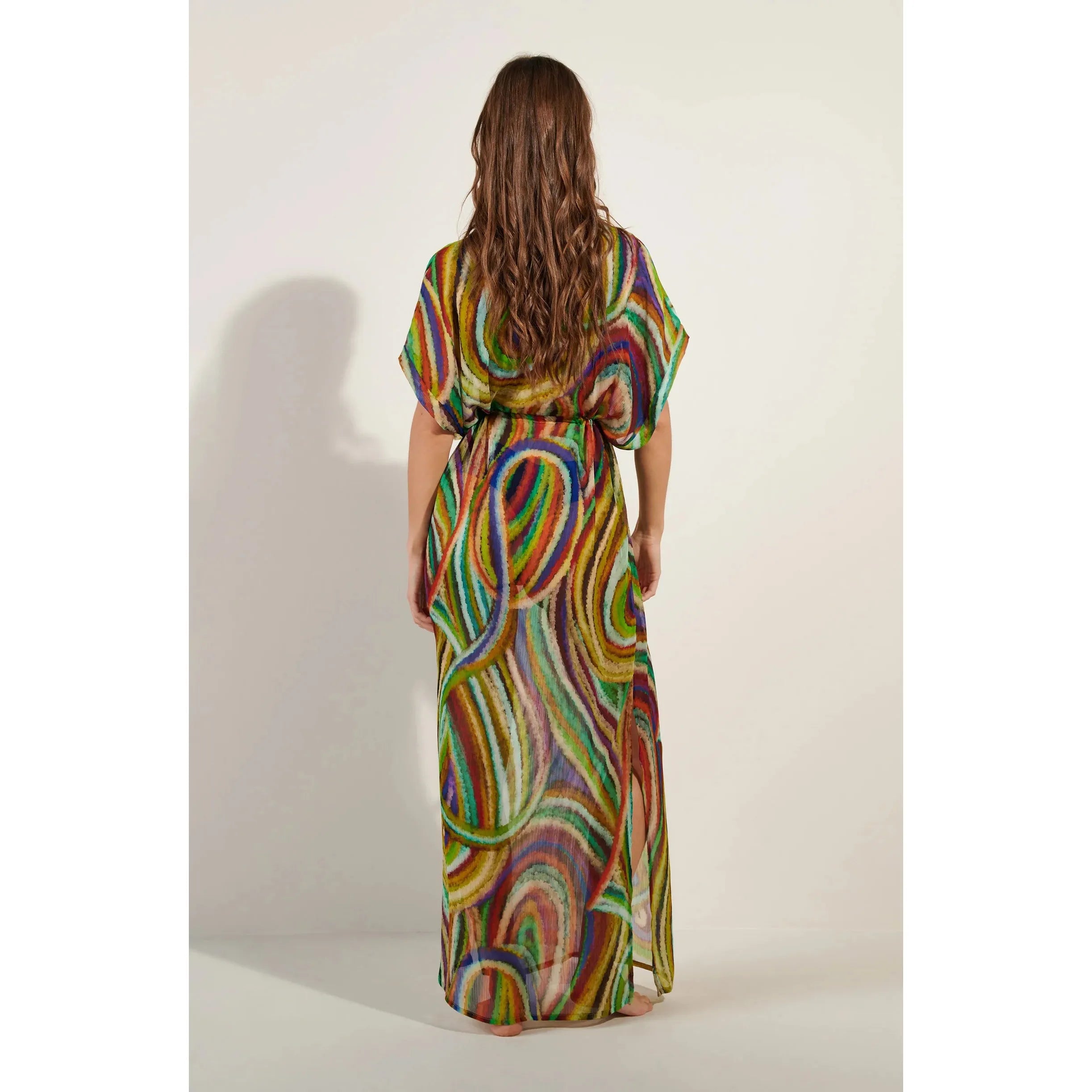 With its loose armholes and its loose cut, the long voile dress NORIE is extremely light. This refined kaftan is adorned with an elegant drawstring at the waist to structure the silhouette. A maze of swirls and intense multicoloured tones.