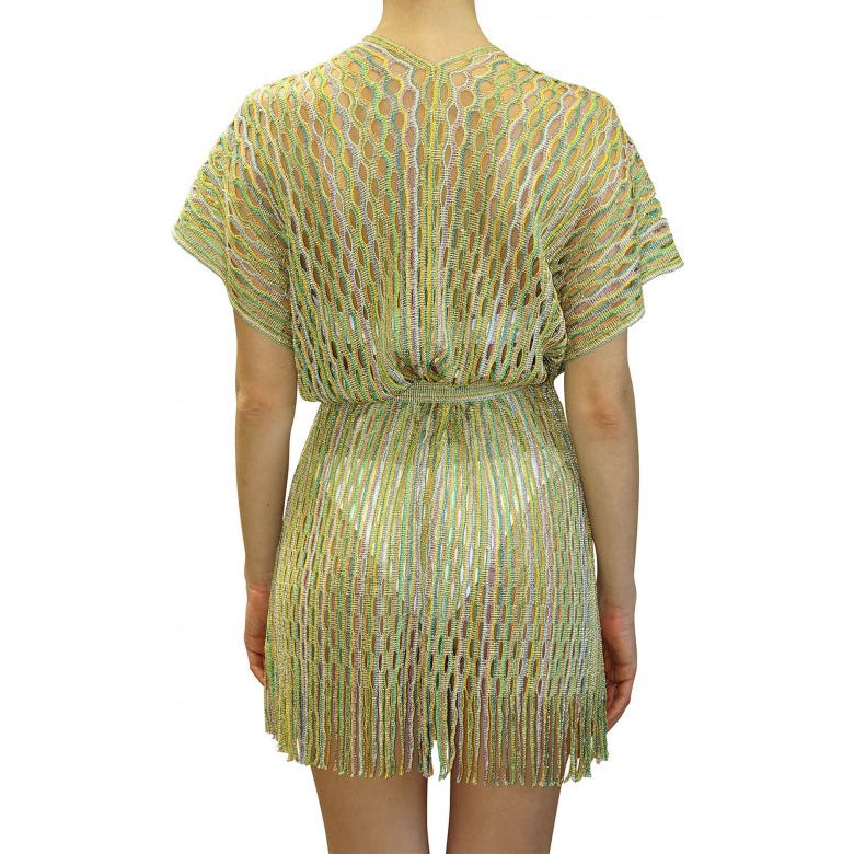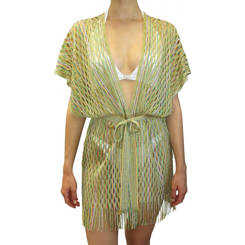 Short belted kimono jacket in wide knitMulticolored net enhanced with gold lurex, fringed at the bottomSlit on the sides