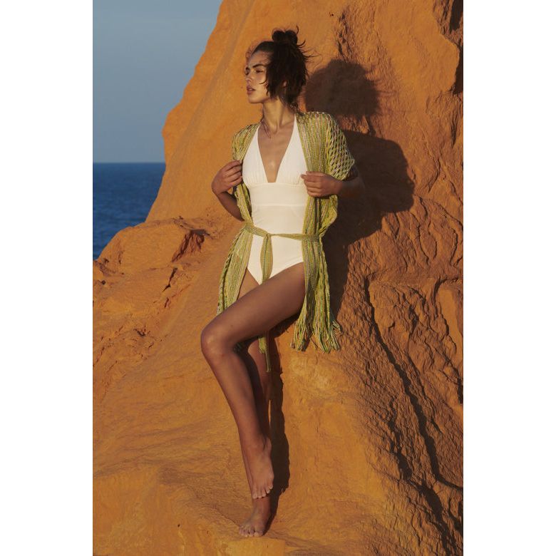An exceptional piece, the VELIA short jacket, designed in wide mesh, intensely reveals the silhouette. In an assertive bohemian style, the iridescent reflections of golden lurex enhance tanned skin. The multi-colored print, a splash of bright, vintage colors.