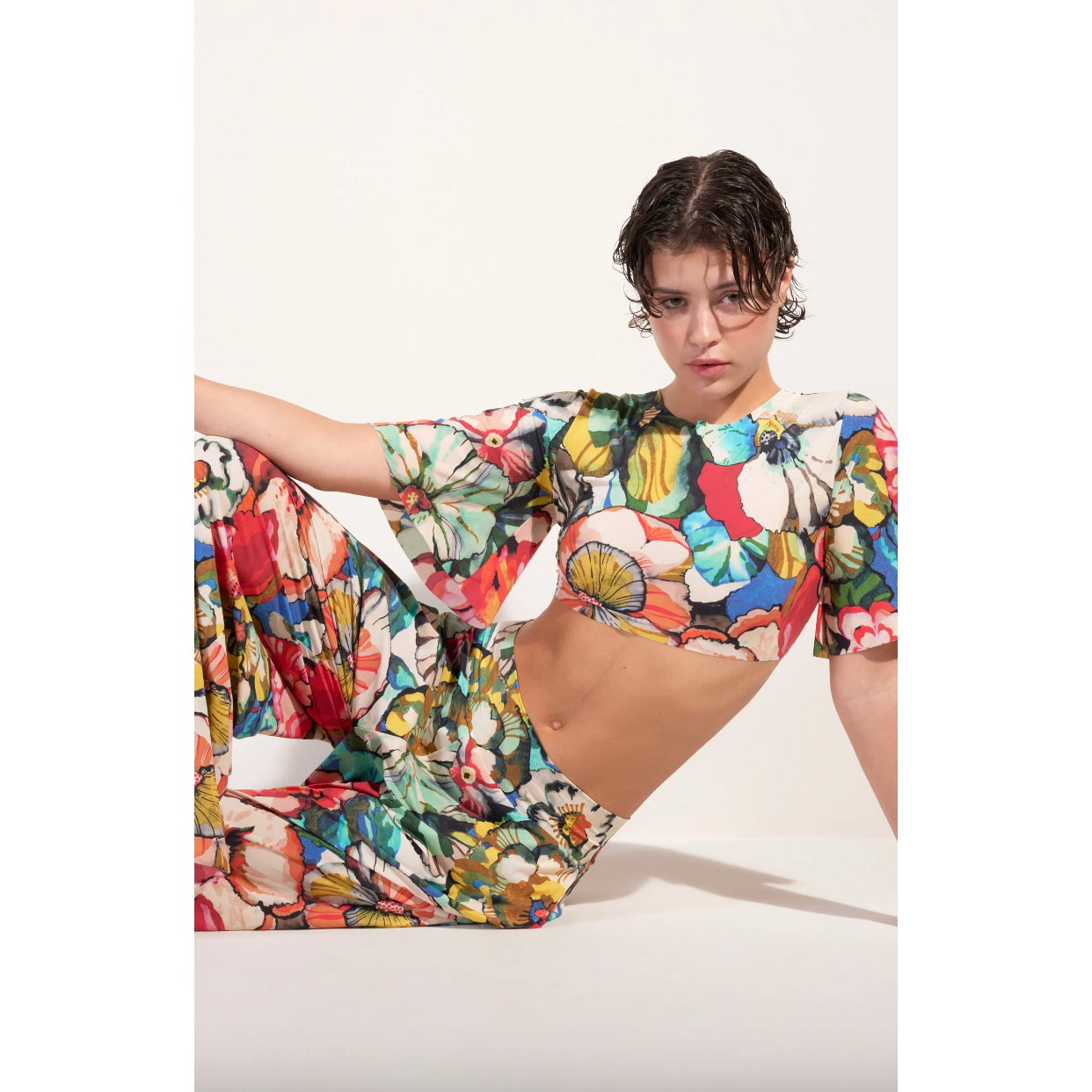 With TAINY, the crop top, wrap effect, is back on the cobblestones and on the beach. With its fitted cut with butterfly sleeves, this top to tie, in the front or in the back, lightly covers the skin from the sun's rays. The Flower print, an exuberant nature where flowers in shimmering colors embody the Flower Power spirit. An invitation to embrace life...