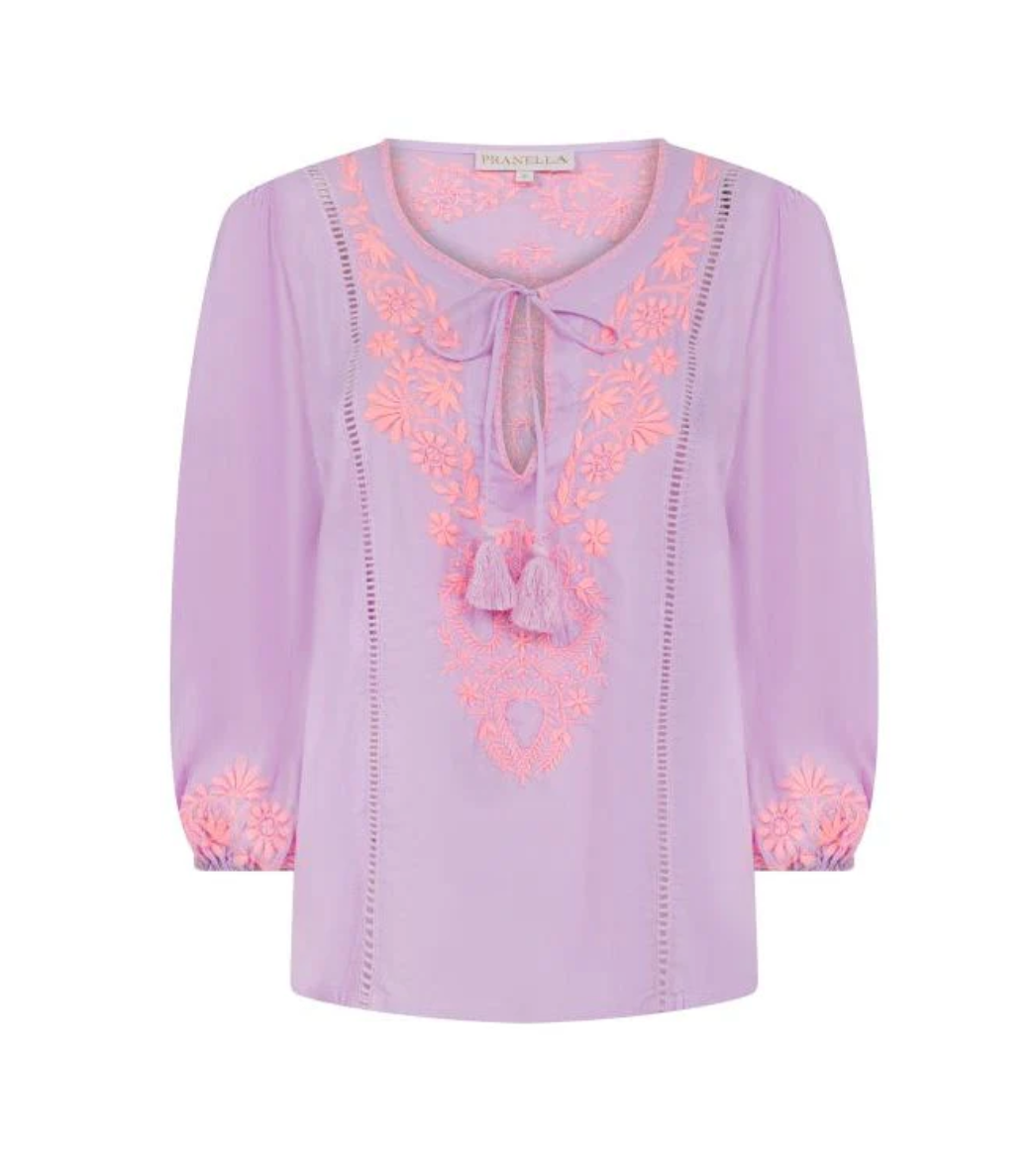 Made with classic cotton and featuring a stylish balloon sleeve, this top is elevated with neon pink embroidery on the front, back, and cuffs. The blanket stitch on the neck and tie tassels add a unique touch. Stay cool and chic this season.