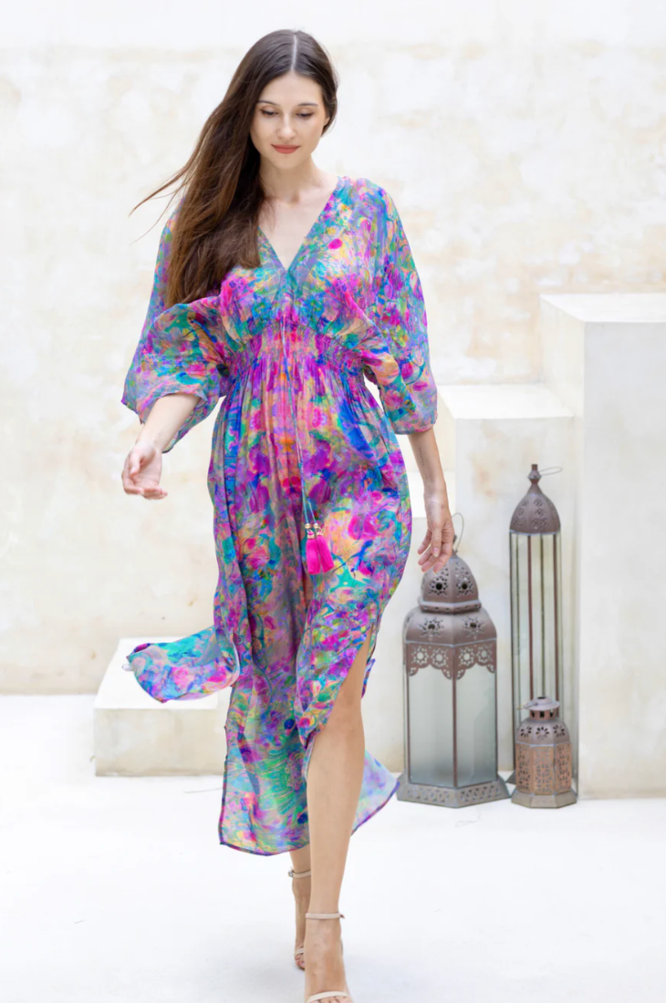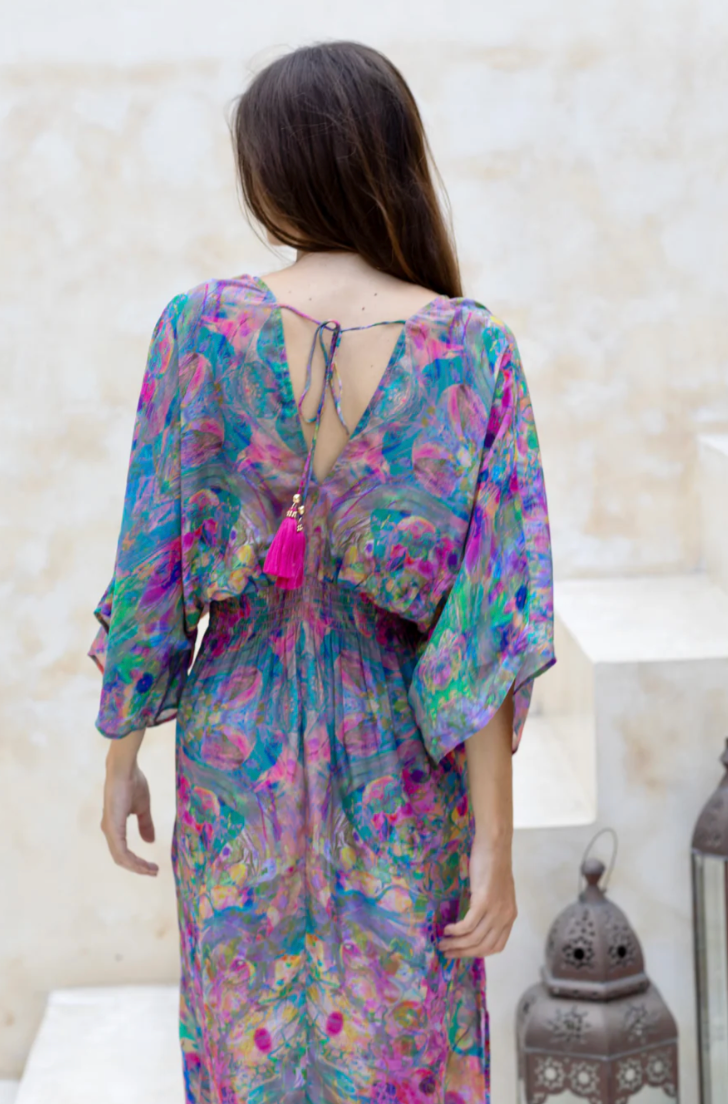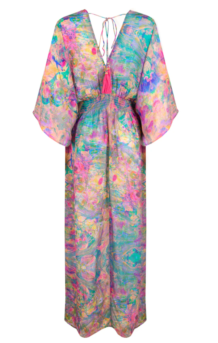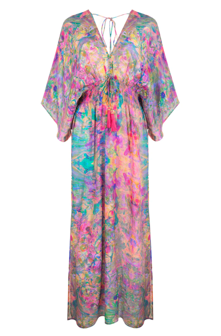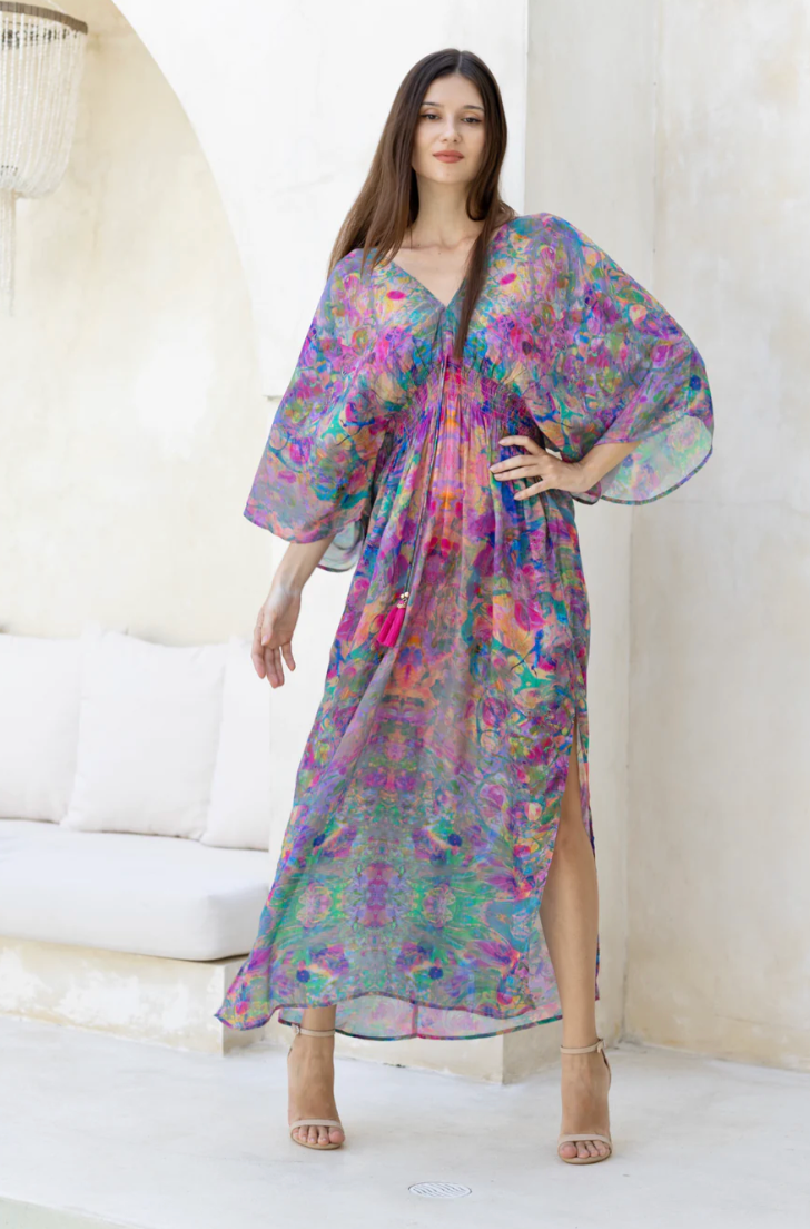 The Capri Kimono dress is the elegant silhouette we all need for our next summer getaway. Made from a beautiful viscose crepe, this maxi dress is light, summery, and necessary! The perfect cover up while lounging by the pool or add a sandal/wedge, along with some statement earrings and you’re evening ready!