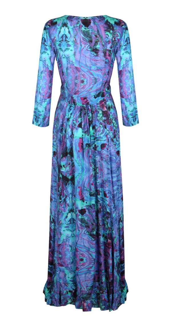 The Maxi Ruffle Wrap dress is crafted from soft, lightweight rayon fabric that drapes beautifully on the body. This flattering wrap style has a discreet internal tie which accentuates the waist area by nipping it in and securing the dress in place, while the outside tie helps display the ruffles which waterfall beautifully downward, continuing around the hemline.