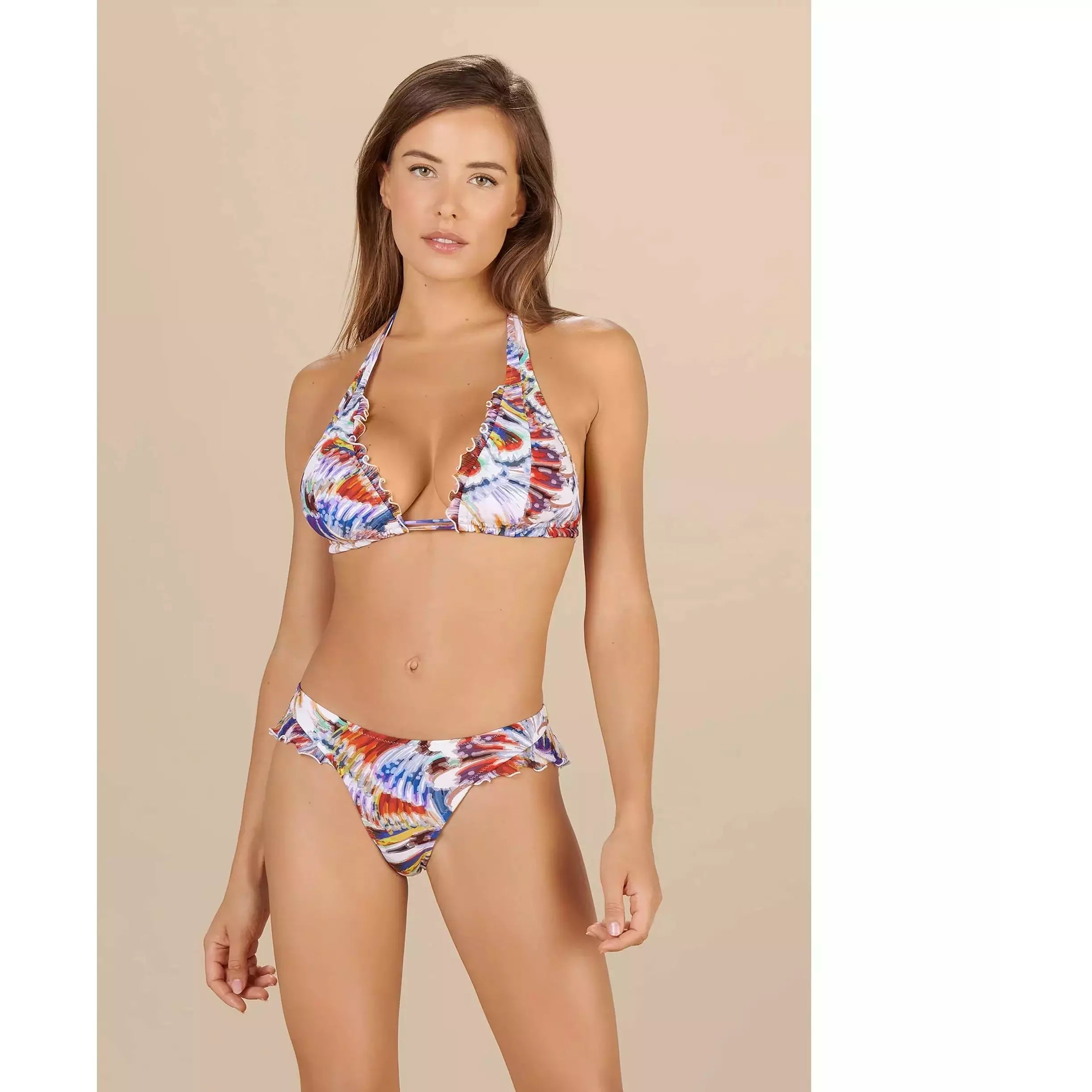 With a clearly Brazilian style, the bikini thong ALALA is both glamourous and feminine. Emphasized by small ruffles at the back, they can be easily worn and bring the perfect volume to your silhouette. Refined, they perfectly match the blush rose bikini top CHLORIS. They can also be worn with transparency with the RIO print beach dress MOLY or the WILD print trousers MALI.