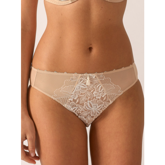 The Agathe collection encapsulates the key trend of mixing styles, with the richness of a pattern and the lightness of a trompe l'oeil pleated effect. This underwired low necked bra composed of 3 parts creates an attractive plunge effect and an elegant shape with a guaranteed comfort at all times. The ivory colour of this item, with its unique support, creates an ultra-modern sensual and elegant look.