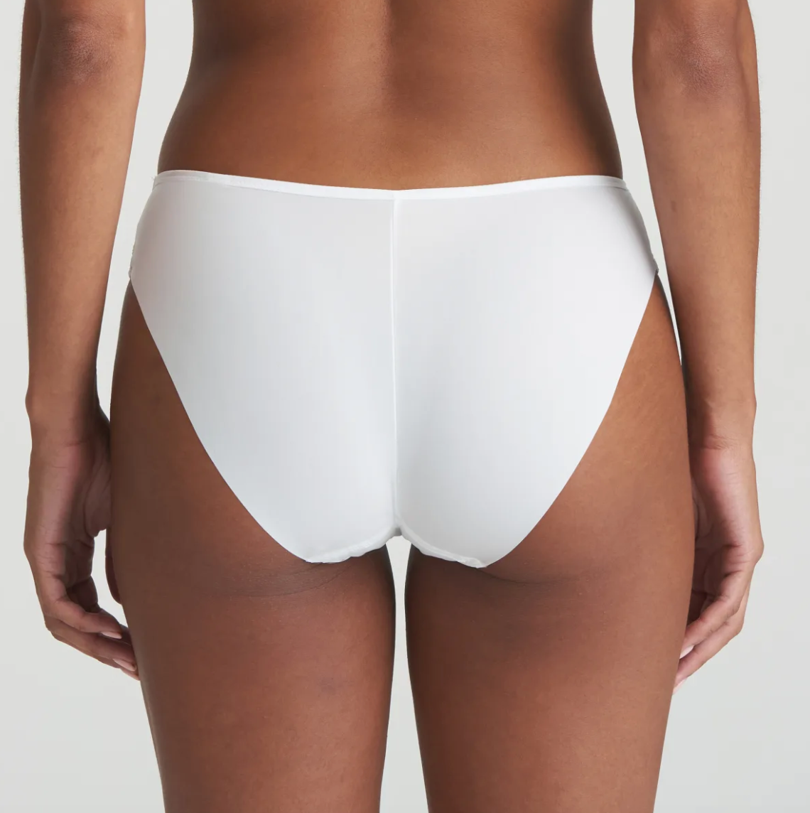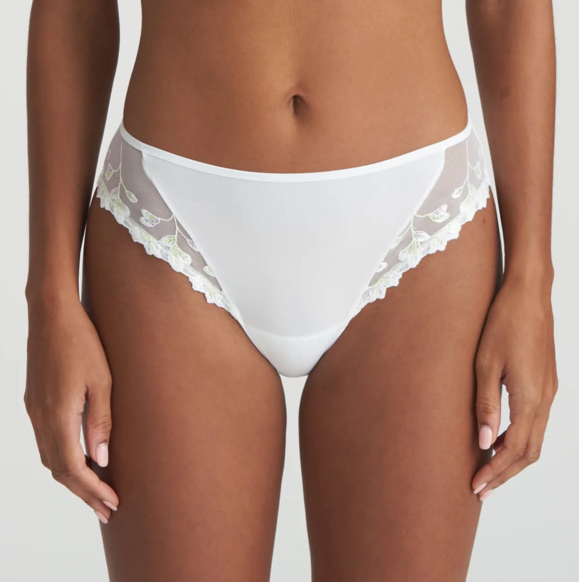 Feminine rio briefs with embroidery at the hips, airy tulle at the waist, and a comfy seamless fabric at the back. Summery White looks fabulous with trendy, colourful accents, like neon yellow or fresh lilac.