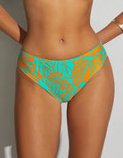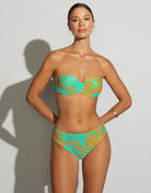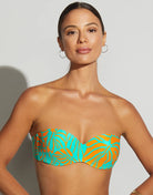 The Irina Bandeau bikini set from Roidal in a beautiful palm leaf print of green and orange, is a matching bandeau-style bikini top with underwired cups, padded cups, a clip back and optional halter strap. Paired with a hipster bikini pant with a medium legline and moderate coverage.