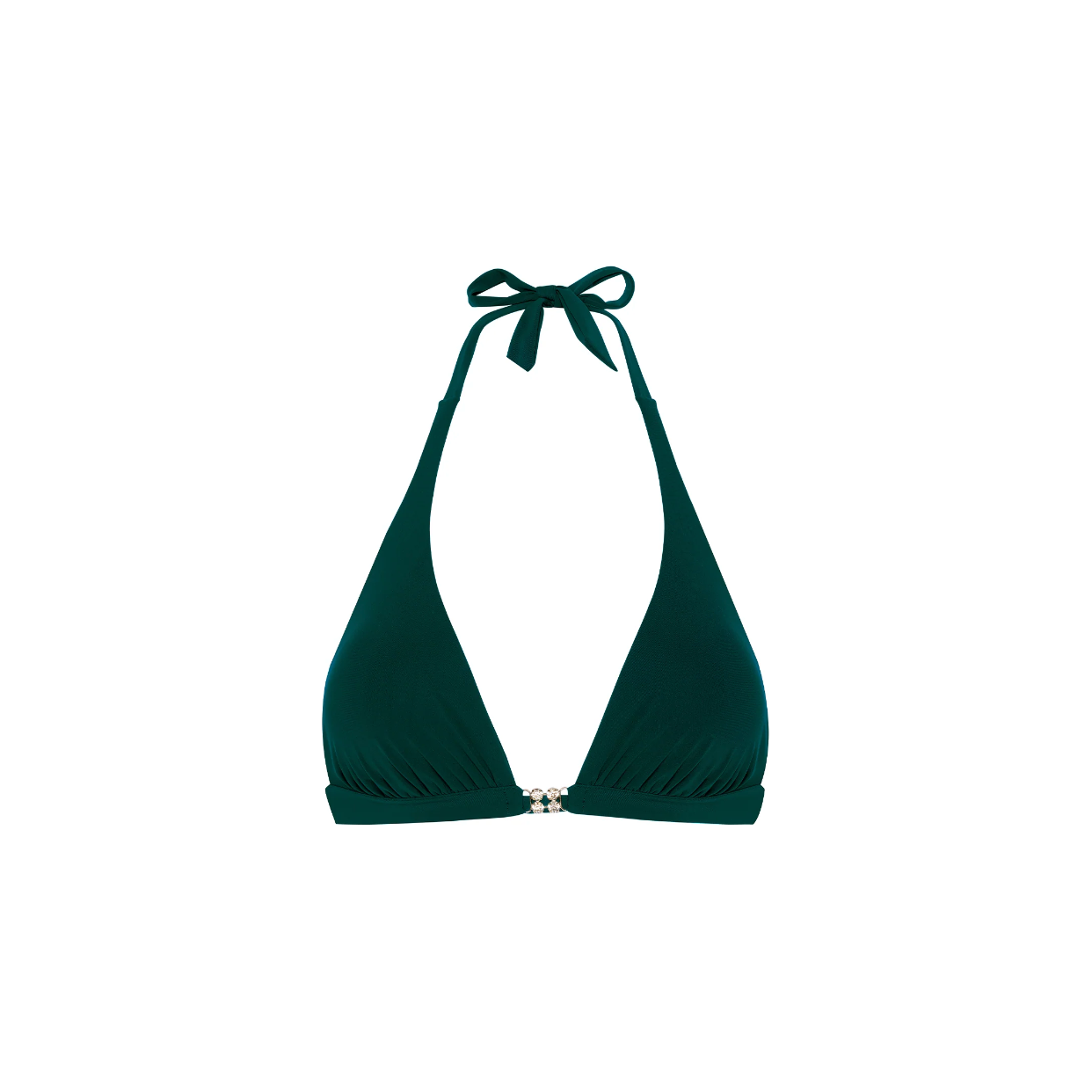 The bikini top ANEA is adorned with delicate golden zamak jewels between the breasts. These rhinestones enhance the generous neckline of this triangle top. The wide cups and the underwires ensure utmost support to this bikini. Bamboo, a dark green colour that is an ode to nature.