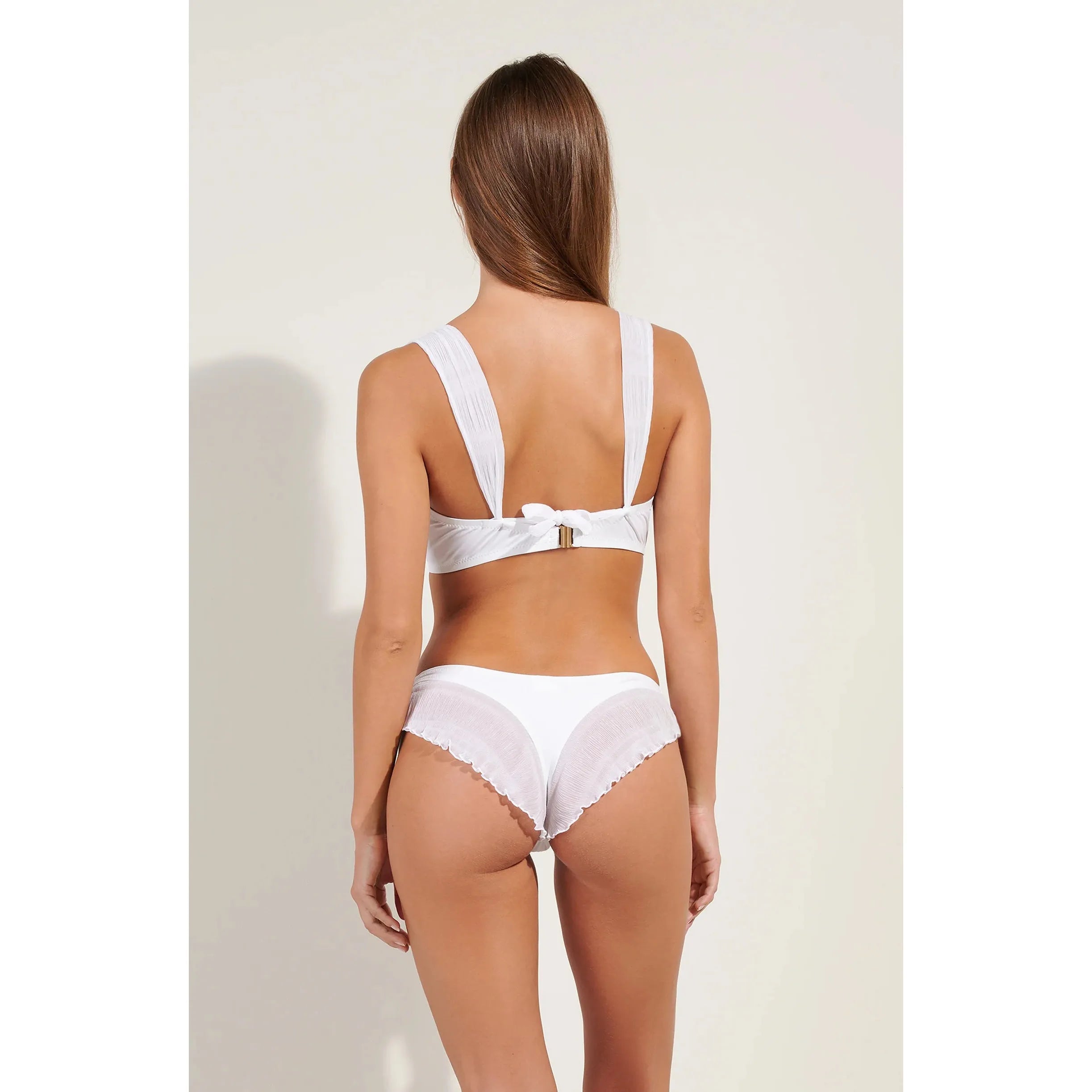 Full of elegance and originality, the white bikini top DJANGO allows you to vary styles thanks to the many ways of closing it. As a triangle top or crossed at the front, it fits all your wishes. Particularly fitted to generous breasts, the underwires support the neckline while the moulded cups redraw your silhouette by enhancing your feminine curves, this model will surely turn you into a siren!