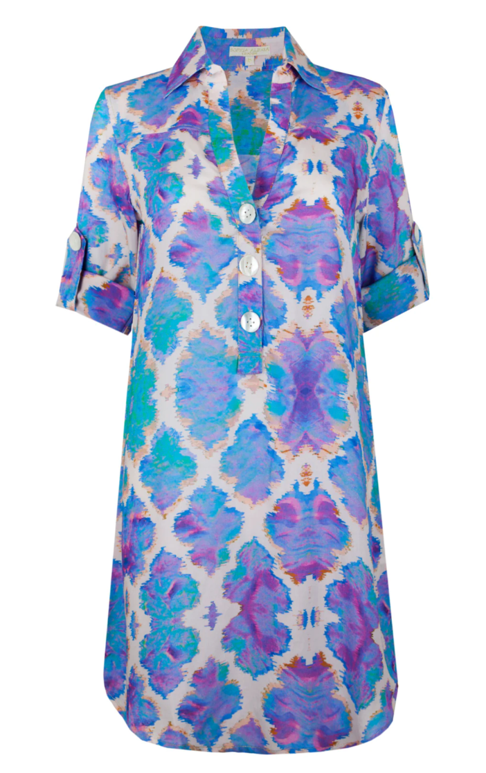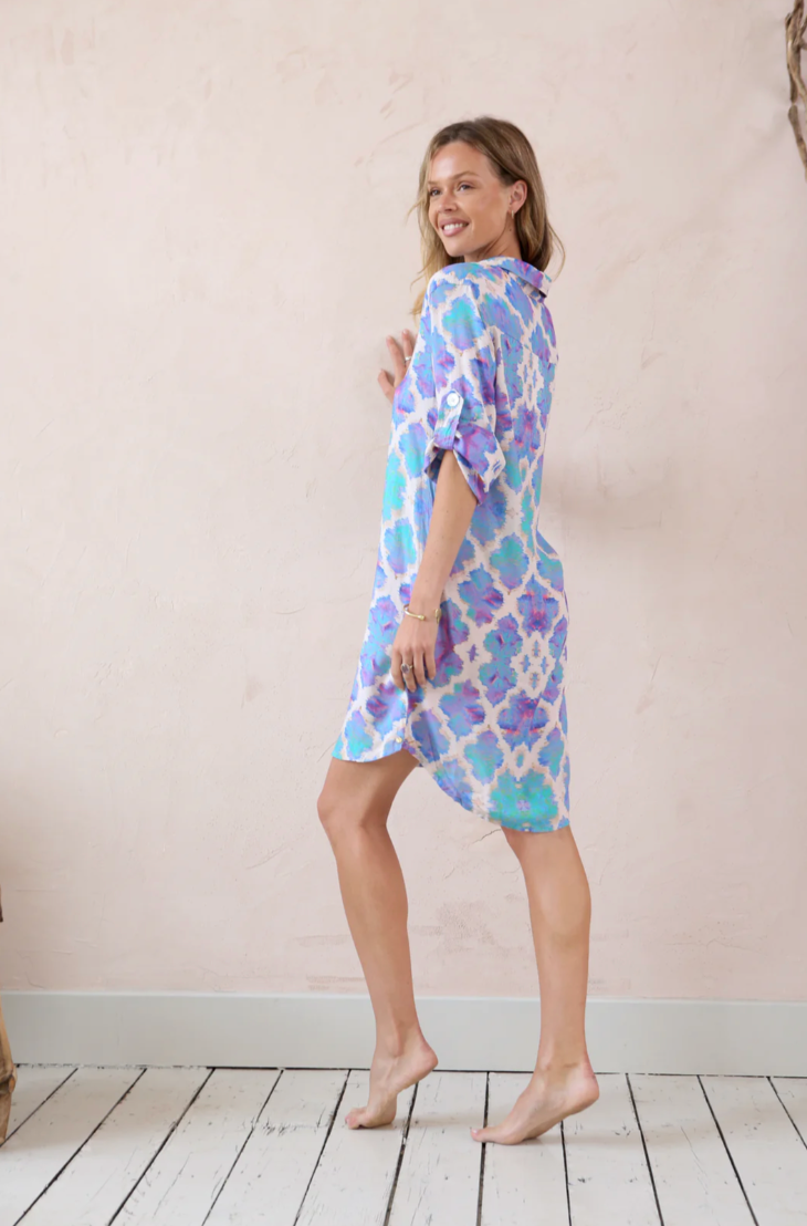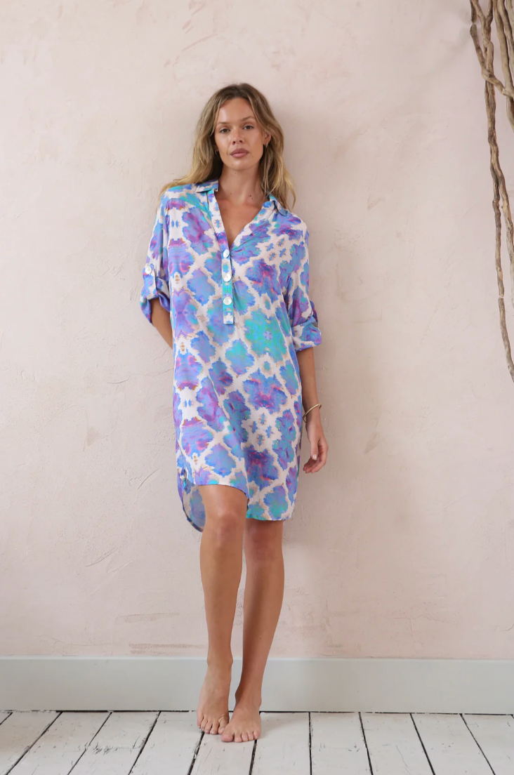The vibrant Sophia Alexia beach shirt has a flattering collared v-neckline with a button-down design. It is loosely structured for a boho-chic feel, keeping you effortlessly cool in the sun. This above the knee style has adjustable sleeves with button fastening, a curved hem that falls slightly longer at the back and features large pearlescent shell buttons and gold stitching.