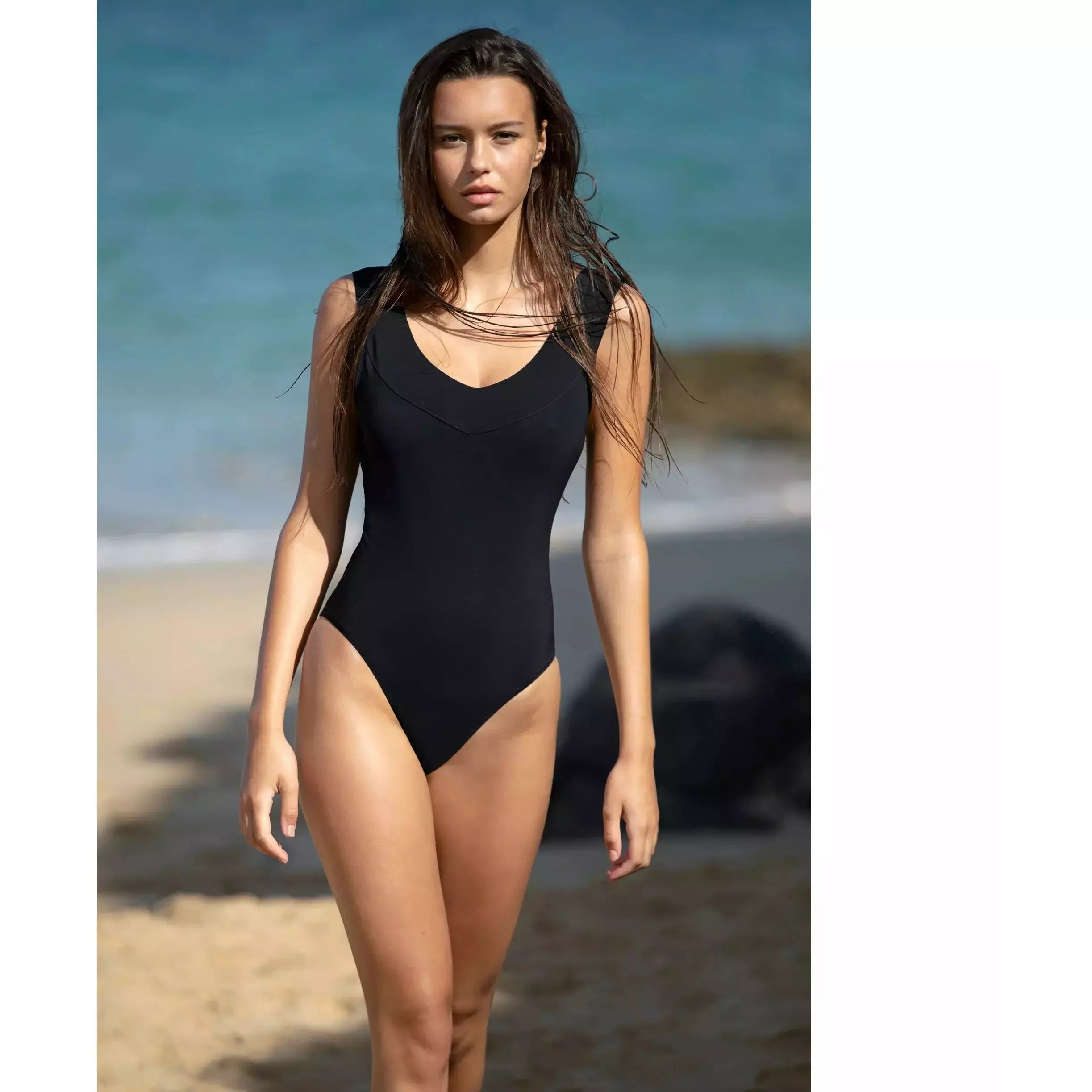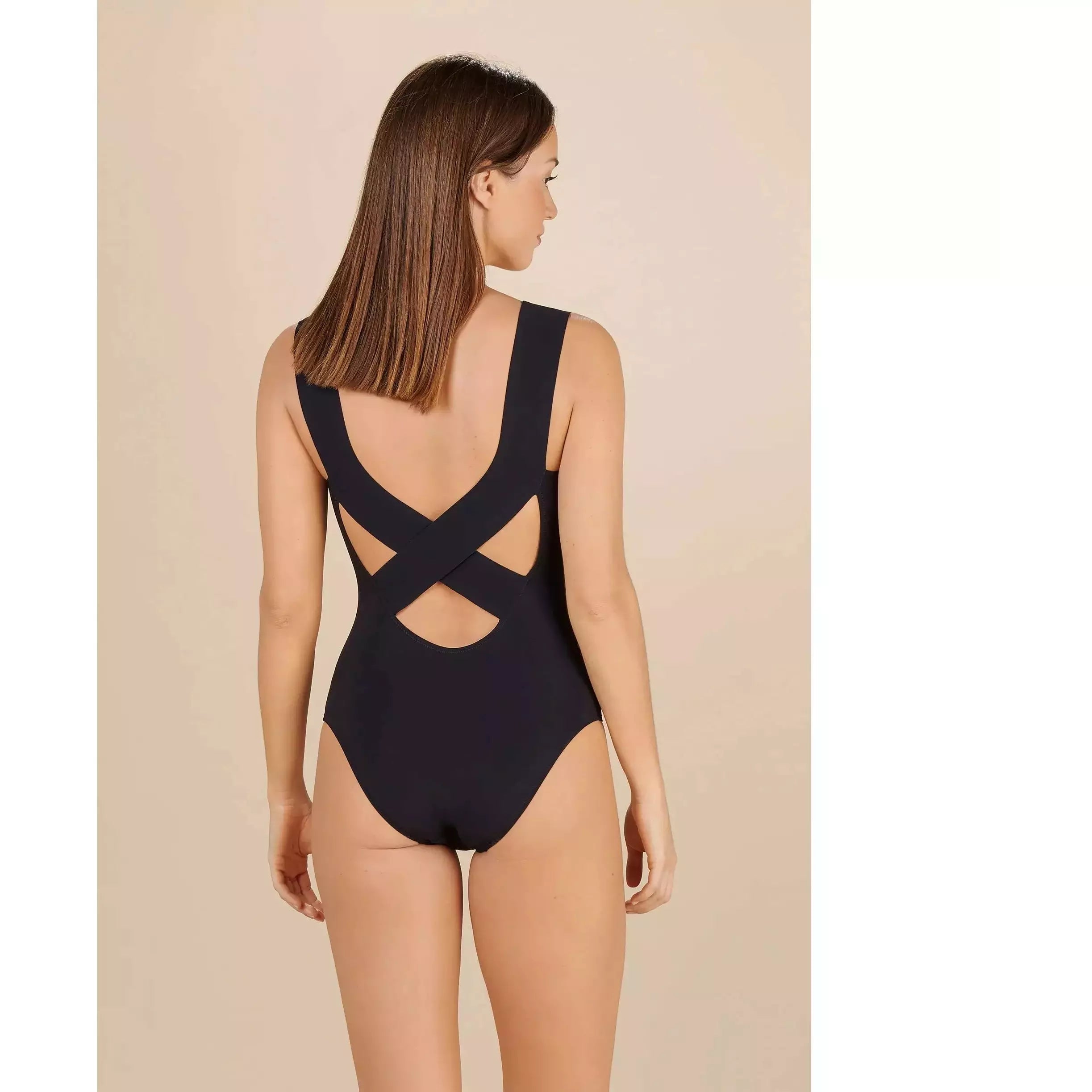 Fall for the iconic smart and sportswear cut of the black racing swimsuit AYOS. The Bonded straps crossed at the back fit all body types. Swimsuit on the beach or elegant bodysuit in town, AYOS will seduce you in all circumstances. Its V-neckline expresses your femininity with energy. Lined or removable cups, AYOS will enhance all silhouettes.