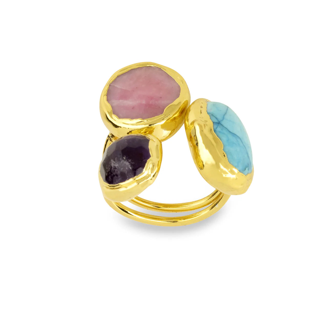 Handcrafted by artisan jewellery makers, the Amelie Ring features organically shaped pink jade, turquoise and amethyst gemstones.