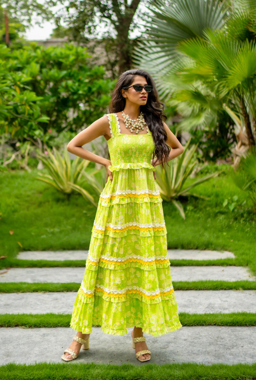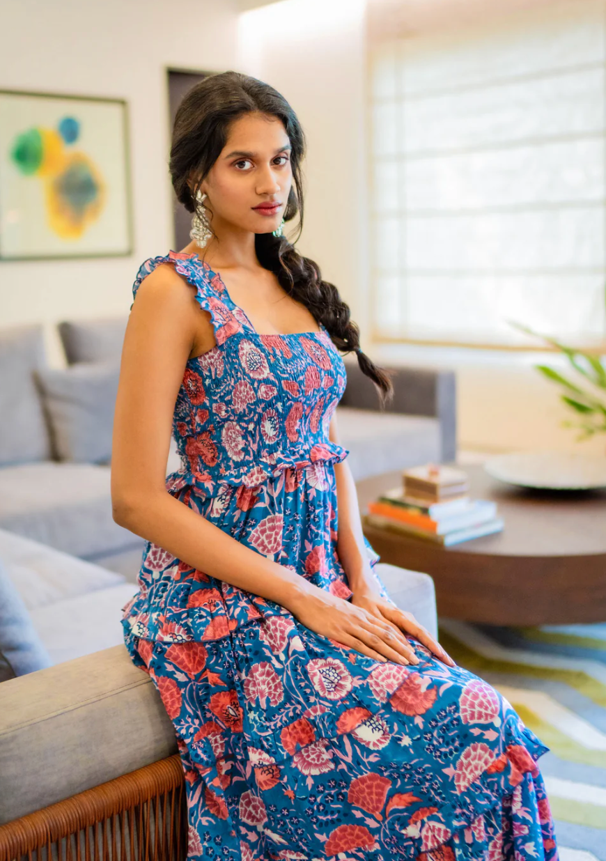 A Sohana favourite, the Mia dress. Made from organic cotton with a unique handprinted pattern with lace detailing. This sleeveless maxi dress will be your wardrobe staple this summer.